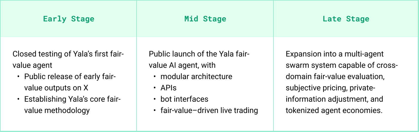 - Early Stage: Closed testing of Yala’s first fair-value agent, public release of early fair-value outputs on X, establishing Yala’s core fair-value methodology.