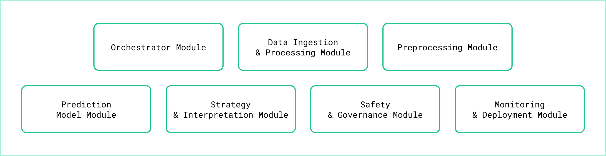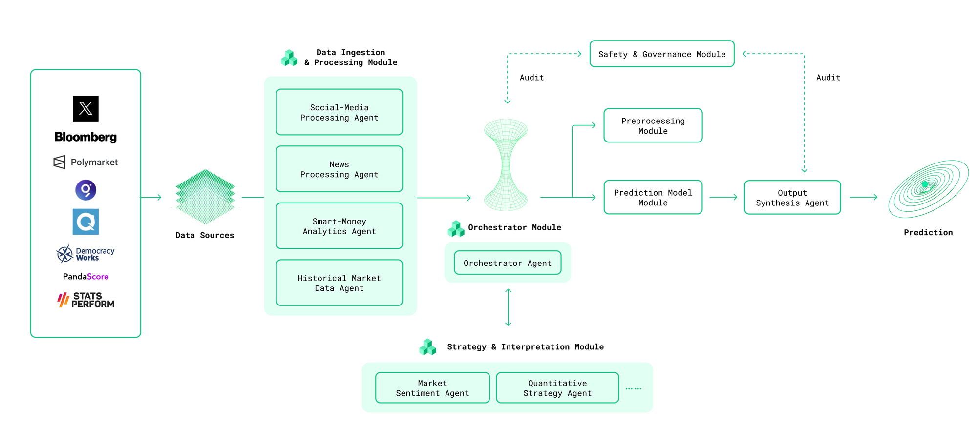 - Prediction Model Module: Uses an ensemble of LSTM, Transformer, and other time-series models to generate probability forecasts and risk-neutral fair-value estimates based on the unified feature space.