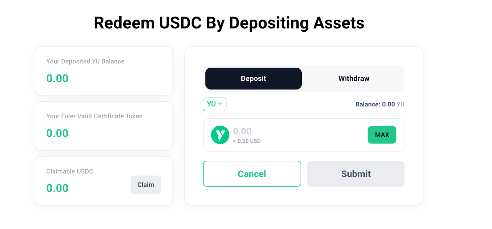 Deposit YU or Euler USDC Vault Tokens into the Redemption Pool.
